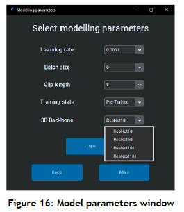 Once the data processing is complete, inputs pertaining to the modelling component of the CV-HART are provided by the user. The user can decide to train a model either from an existing trained model state or from a completely new randomly initiated state. A model can be any deep-learning model that is capable of HAR; however, CNN-based architectures and other deep-learning architectures (designed explicitly for HAR), such as the YOWO architecture, are suggested. In the case of model training, the user is prompted to specify model parameter values. A list of possible parameters (typical value ranges or options) is shown in Table 1.