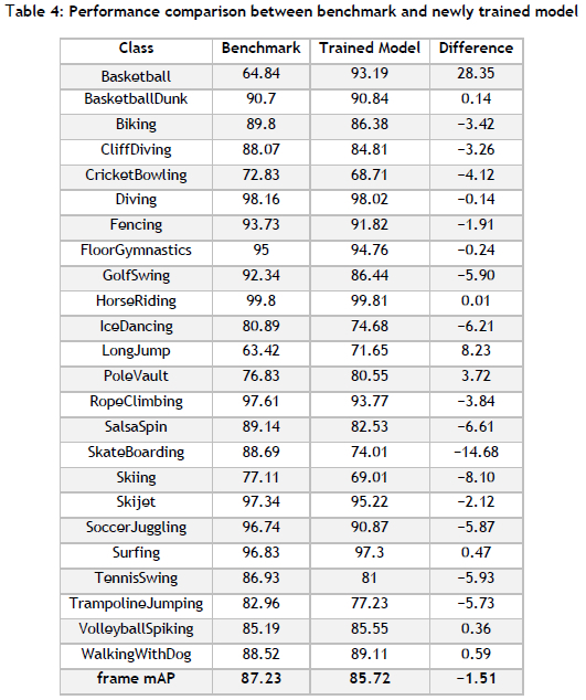 A summary of a performance comparison between the benchmark and trained models is presented in Table 4. The performance achieved by the CV-HART model is similar to that of the benchmark model; the overall performance is only 1.51% inferior. Eight of the 24 classes show an increase in AP: the LongJump and Basketball classes show significant increases of 8.23% and 23.35% respectively. The other 16 classes, however, experience a reduction in performance, eight instances of which correspond to a reduction larger than 5%. The largest reductions occur in the Skiing and SkateBoarding classes - i.e., 8.10% and 14.68% respectively. The performance differences are not entirely unexpected, as the original authors did not provide their random seeds for model weight initialisation. Overall, performance is mostly similar, and therefore further empirical proof of verification is demonstrated.