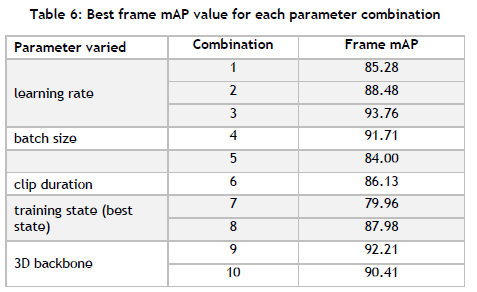 An additional verification step involves training a new model from scratch and subsequently comparing the algorithmic performance. To this end, the original parameter values employed by Köpüklü et al. are used again (shown in Table 2). The following computational resources are employed for the model training: a computing cluster comprising eight computer nodes with three identical graphics processing units per node; Nvidia Tesla T4, Nvidia Quadro RTX 4 000, and Nvidia Quadro RTX 6 000 GPUs; and for each node, two Intel Xeon Gold 5218 central processing unit processors with at least 376 GB of RAM per computer. The following modelling results (in respect of frame mAP) are obtained for the five respective epochs (in ascending order): 83.15, 82.05, 85.72, 84.52, and 83.86. The best model is therefore obtained after epoch three, with a frame mAP score of 85.72.