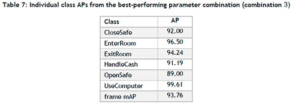 A summary of the final results for each parameter combinations is shown in Table 6, where the frame mAP values for the best epoch for each parameter combination are shown. Only one parameter combination, combination 3, improves on the baseline performance. Combinations 4, 9, and 10 achieve admirable performance (greater than 90.0). From the results, it can also be reported that the model exhibits notable sensitivity to the training state parameter, followed by the learning rate and batch size parameters. The best-performing model corresponds to combination 3, and so is employed for the remainder of this case study. A summary of class-specific performance is presented in Table 7. The performance is consistent across each class. OpenSafe is the only class with a score less than 90%. The best-performing class, UseComputer, shows a near-perfect score of 99.61%.
