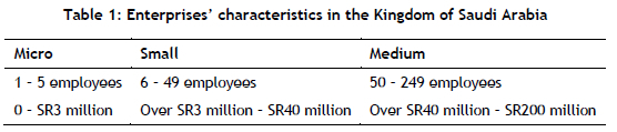Enterprises in the KSA face several difficulties as a result of globalisation and increased numbers of foreign products from multiple countries in local markets. Moreover, there is a high level of demand from customers to buy products of better quality, a fast mode of delivery, and reasonable prices. Thus entrepreneurs seek to respond to customers' requirements and to give satisfaction by using advanced technology or tools such as mobile applications, internet-based tools, and integrated database-based technologies [12]. Saudi Arabia has been concerned about expanding the role of SMEs in its economy. In 2020, the government offered small enterprises financial support of around SR50 billion to overcome the crisis of COVID-19. This action was taken to attain the goal of Saudi Vision 2030, which includes increasing SMEs' contribution to GDP from 20 per cent to 35 per cent and raising the private sector's contribution from 40 per cent to 65 per cent. The KSA used the following characteristics of enterprises [26]: