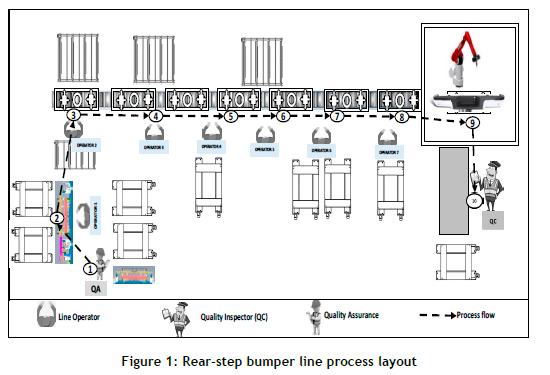 The rear-step bumper assembly line is responsible for the production of rear-step bumpers. The first step in the process is the delivery of frames that go through a quality gate and then are assembled to form the primary structure of the bumper. This is done away from the production assembly line. The process then adds more components to the frame assembly, such as sensors, endcaps, step-pads, and towing bezels. At the completion state of the assembly, an automated roamer machine is responsible for parameter and tolerance checks on the finished product. A secondary final inspection is then conducted to check the aesthetics of the final product. Figure 1 indicates the layout of the process, and how quality gates are stationed on the production line to ensure adherence to quality standards.