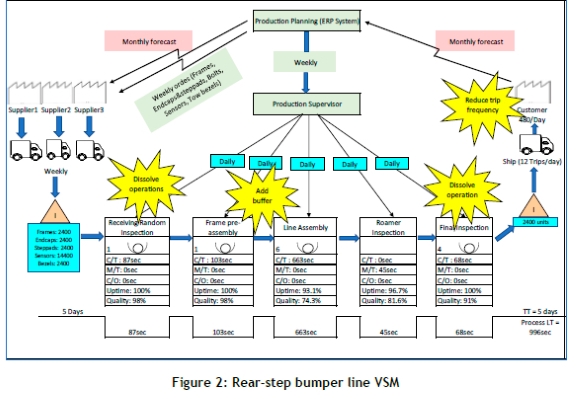 The value stream mapping (VSM) of the rear-step bumper line begins by acquiring the monthly forecast of production demands according to their respective derivatives. The information is then cascaded to three suppliers to deliver assembly components each week. The warehouse stock holding capacity in the plant can only hold stock for five days. The forecast is also inserted into a manufacturing plan and cascaded to the production supervisor, who then sends it to the production line operators daily. The inventory point carries 2 400 units, which is equivalent to a stock holding of five days. The production line runs 24 hours a day with a shift target delivery of 160 units. The total time that the components stay in the system from acquisition to finished product is five days. The processing lead time of the production line is 996 seconds - the time it takes for one bumper to be assembled from the initial random inspection operation to the final inspection. Deliveries by a truck with a carrying capacity of 40 units per delivery are made to the customer 12 times a day. Figure 2 illustrates the entire VSM of the manufacturing line and how the components flow through the system.