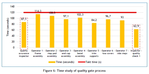 The results of the time study approach to quality gates on the rear-step bumper line are shown in Figure 6. The time study excluded the roaming inspection process, which was not fully commissioned at the time of the study. This reduced the total number of operations for the time study from 10 to nine. Basing the data on nine operations and a takt time of 120 seconds, the line was set up to take 1 080 seconds to assemble a rear-step bumper fully. In the case of this line, the quality assurance operation was included in the study, as it ensured full inspection of all of the parts going into the manufacturing line. Although it was called 'quality assurance', the operation worked like a receiving inspection quality gate. The formation ratio formula was used to determine the percentage loading of resources. Across all nine operations of the line, the formation ratio was 78.34%. This presented a 21.66% gap to load the resources further, either with elements from the quality gates or from operational and technological gaps identified in the SOP study.