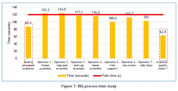 The results of the approach of the BIQ process for the rear-step bumper line are presented in Figure 7. The first quality assurance operation could not be removed because the preceding operations were loaded and the elements required fixing. This constrained the element distribution. The last inspection point also could not be removed owing to layout constraints. At the end of the process, a specialised testing jig did not allow for the elements to be distributed across the line. Taking these constraints into consideration, the line remained with nine operations and 1 080 seconds to assemble a bumper fully. The elements that could could be factored into the operations were the gaps identified in the SOP analysis and the technological improvement that was recommended by the technological value anlysis approach. With the addition of the self-inspection elements, and after training the operators on them, the formation ratio of the line improved from 78.34% to 87.69%. Further line balancing activities were still required to ensure that all of the operations did not exceed the takt line.