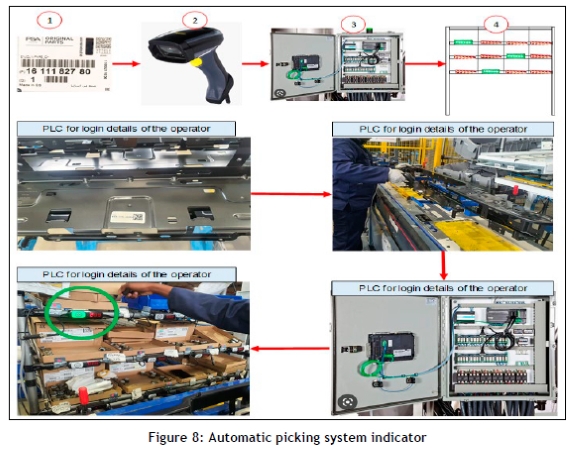 The recommendation of the automated picking system indicator was implemented to provide the process with a foolproof system that ensures that the operator never picks from the wrong bin. The process began with the main frames of the bumper being identified with a barcode sticker. The barcode was then scanned by the first operator. The scanner transmitted the identification information to the PLC. The PLC sent impulses to the rack where the lights were connected. Each of the lights represented a part and the quantity that was supposed to be picked. The lights on the rack lit up according to the derivatives after scanning was programmed into the PLC. The implementation of this automatic indicator ensured that operators did not become confused and pick the wrong sensors. Each sensor was picked according to the block lights on the rack, which was linked to the barcode identification of each bumper.