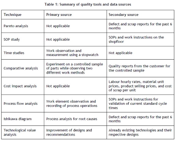 The study employed a range of quality tools to gather and interpret statistical or numerical data. The techniques used in this study were Pareto analysis, SOP analysis, time studies, and a comparative analysis of quality gates and process BIQ. Table 1 summarises the types of data that were collected relative to the techniques that were used. Following the re-distribution of the elements in the time-study analysis, a comparative analysis was conducted to compare the quality results between using BIQ and the conventional approach of using quality gates. This was conducted in the form of an experimental study.