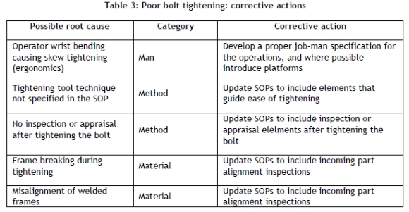 The results of the Ishikawa diagram for the poor bolt tightening defect indicated that there were five possible root causes to the defect. The root causes ranged from ergonomics, poor SOP construction, and misalignment of specifications for parts delivered on the line. The operational corrective actions of the root causes that needed to be implemented are outlined on Table 3. At the centre of the corrective actions, is the aim to drive BIQ in the manufacturing process.