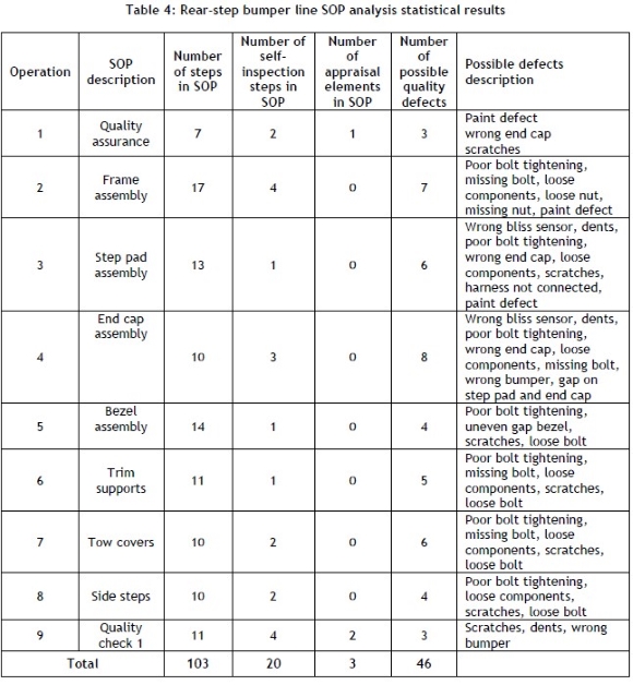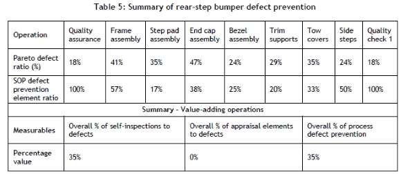 A percentage ratio summary table was developed for the overall results of the SOP analysis. The results indicated that the line had an overall self-inspection ratio of 35% and no appraisal elements. The lack of appraisal elements presented an opportunity for element execution verification, such as the tightening of bolts, screws, and nuts on the production line. These were elements that could be incorporated into the SOPs to drive BIQ. Given the lack of appraisal elements, the overall defect prevention ratio of the line was 35%. By updating the SOPs, a greater percentage of defect prevention in each operation could be realised. Table 5 summarises the overall defect prevention percentage ratio results of the SOPs on the rear-step bumper production line.