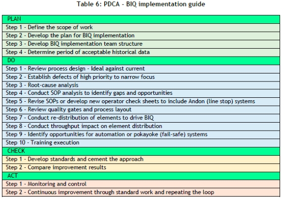 In line with the objective of developing a strategic approach to implementing BIQ, the key components of the building processes for BIQ needed to be evaluated from a planning, doing, checking, and actioning perspective. There was a need for the development of a strategic guideline for ACMs to implement BIQ in their manufacturing streams. It is important to highlight that BIQ starts at the design phase, where the quality management team specifies the quality objectives and sets the operational processes and resources to meet the quality objectives. As a continuous improvement initiative, Table 7 outlines the PDCA approach as a foundation for ACMs to implement BIQ.