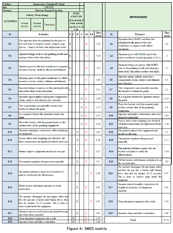 Finally, the time was recorded with the implementation of the tools, resulting in a reduction of 35.34 minutes. This was achieved thanks to the immediate availability of the main tools for the operator and better organisation in the work area. The results are shown below in Table 5: SMED implementation.