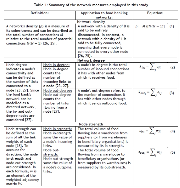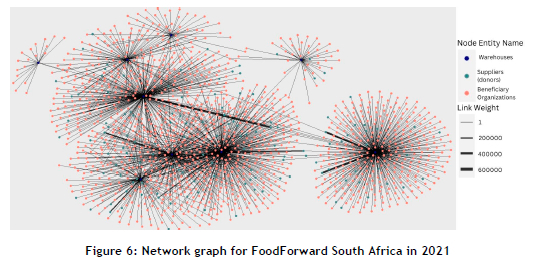 Since research on the supply chain networks of food banks in developing countries has remained relatively limited, this study intends to contribute to this area of research. FoodForward South Africa has compiled a rich dataset that connects its various supply chain partners (i.e., farmers, manufacturers, retailers, warehouses), the flow of stock (volume of food), beneficiary organisations, and their locations and time stamps of transactions. Transactional data can be analysed using complex network approaches to uncover relationships in the flow of food between supply chain partners (e.g., donors), food bank warehouses, and beneficiary organisations. FoodForward South Africa could benefit from investigating the relationship between the total number of connections in its network and the weight (i.e., the volume of food flowing between partners) of those connections when planning its strategic capacity and designing its supply chain.