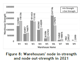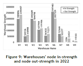 Based on Table 4, the warehouse's high mean in-strength and out-strength values indicate the network's ability to handle extremely high volumes of food. The average volume of food entering warehouses increased by 27.49 per cent from 2021 to 2022, while the average volume of food leaving warehouses increased by 29.65 per cent. Figures 8 and 9 compare the volumes of food entering (in-strength) and exiting (out-strength) each warehouse for 2021 and 2022, respectively.