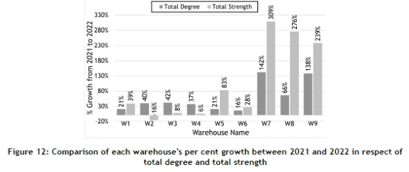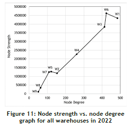 In contrast, others may have limited storage and distribution capacities. This relationship could help to streamline operations for optimal efficiency and effectiveness. It may, for instance, be necessary to support and optimise resource allocation for warehouses with a high node degree but a comparatively low node strength. Likewise, warehouses with high node strength but a low node degree could need scaling up or improved network integration.