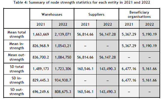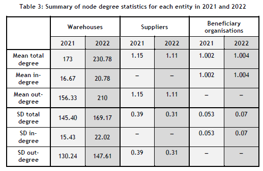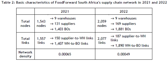 Table 2 compares relevant characteristics (i.e., network density and size) of FoodForward South Africa's supply chain network in 2021 and 2022.