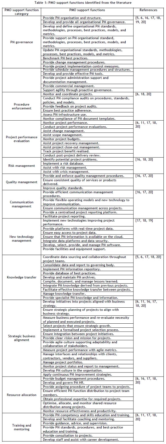 PMO support functions identified from the literature correlate between various studies, confirming that certain PMO support functions are required from all PMOs, regardless of industry or PMO setup. Eleven categories comprising 84 PMO support functions are identified from the literature, and are shown in Table 1.