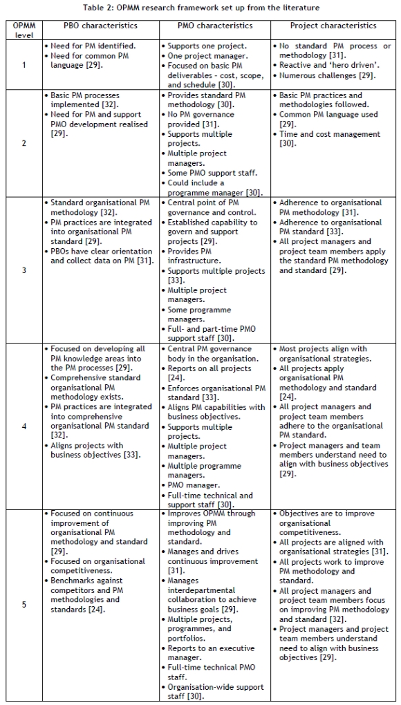 The OPMM framework shown in Table 2 was developed from the literature to ease the identification of a PBO's OPMM level and to answer the first research question. Most P3Ms consist of five levels [16, 26]; therefore, it is sufficient for the framework to consist of five OPMM levels. This table includes the PBO-, PMO-, and project characteristics identified from the literature.