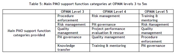 Only data for the PMO was recorded, as small projects did not have a PMO. The PMO provided data only on OPMm levels 3 to 5, and concluded that all the PMO support functions listed in Table 1 are provided at these OPMM levels. The study opted to identify the main PMO support function categories for each OPMM level. The main PMO support function categories for OPMM levels 3 to 5 are shown in Table 5.