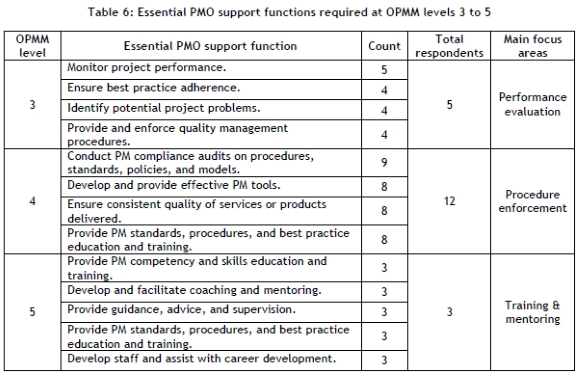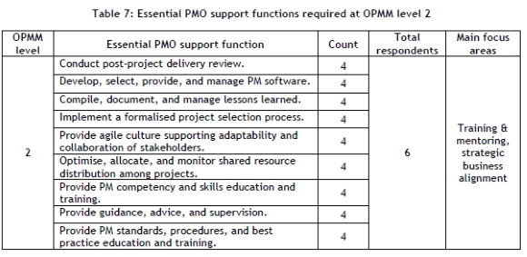 Conclusive results were only obtained for OPMM level 2 in the small projects semi-structured interview and the structured survey data. Table 7 shows the essential PMO support functions and the main focus areas identified.