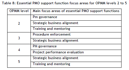 To obtain a holistic view of the company, the essential PMO support functions, which represent about 50% of the highest counted essential PMO support functions that were identified for each OPMM level, were determined. Table 8 shows the main focus areas of these functions for OPMM levels 2 to 5.