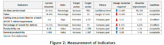 Based on the analysis that was conducted and the identification of the core problem, a design rooted in the lean manufacturing philosophy was developed, targeting a reduction in defects and waste to eliminate non-value-adding activities. The application of lean tools improved the cutting process, resulting in a reduction in its operational time from 3.40 days to 1.12 days for a batch of 845 t-shirts, surpassing the company's target of 2.11 days.