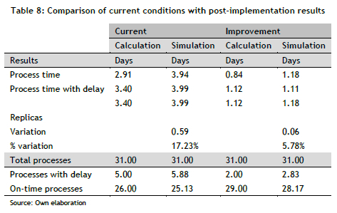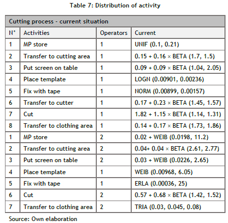 The logical model was constructed by applying software tailored for discrete event simulation. The company's system was simulated using the Arena tool. In addition, the distributions for each of the system's activities were obtained; this data is consolidated in Table 7.