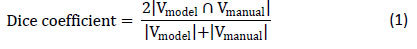 where Vmodel is the set of predicted pixels or voxels and Vmanual is the set of manually annotated pixels or voxels. A Dice coefficient of one indicates perfect agreement between the manually segmented image and the predicted segmented image, while a dice coefficient of zero indicates no overlap. The model proposed by Iwamoto et al. [30] achieved a dice coefficient of 0.83, which indicated that the segmentation results mostly agreed with the manual segmentation.