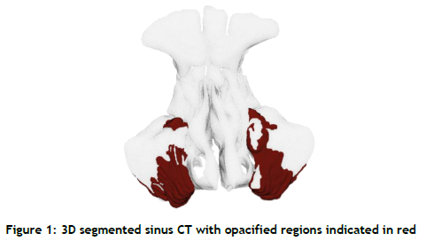 Once segmented, the sinus system can be visualised and the opacified areas highlighted, based on the corresponding HU units of the original CT scan, as illustrated in Figure 2. In addition, the exact amount of opacification can be calculated and presented alongside the model output.