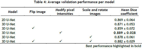 The 3D U-Net was trained using a batch size of four and a learning rate of 0.0005, while the 2D U-Net was trained using a batch size of 256 and a learning rate of 0.005. The batch size could be increased for the 2D U-Net, as the 2D U-Net consisted of about 1.6 million trainable parameters compared with the 4.7 million or so parameters of the 3D U-Net. The mean Dice coefficient, along with the standard deviation of the models and data augmentation strategies that were considered, is provided in Table 4.