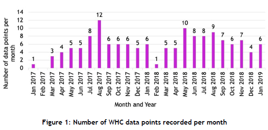 The dataset contained 587 data points with the date and percentage coverage between 1 August 2015 and 27 March 2021. During 2020 and 2021, the WHC was influenced by restrictions on human movement during the COVID-19 pandemic, and did not reflect normal WHC levels. It was, therefore, excluded from the study. The remaining 461 data points were not sampled during regular intervals. Figure 1 shows an example of the count of data points per month for a section of the dataset from January 2017 to January 2019.