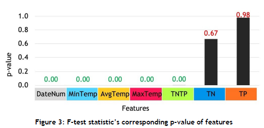 Next, the significance of the features was tested by calculating the corresponding p-values of the F-test statistic. Figure 3 shows the p-values for all features. Values below 0.05 represent features of significance. The figure shows that the Date, MaxTemp, MinTemp, and AvgTemp features all had p-values of 0 and thus had high significance.