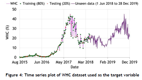 A final test was conducted to evaluate the model's performance if the training, testing, and unseen datasets were randomly selected points over the complete WHC dataset. The data were again split into three datasets: training, testing, and unseen. The model returned an RMSE of 3.63, confirming that day-to-day predictions instead of months in advance result in more accurate results. The plot in Figure 15 shows the predictions on the randomly selected unseen dataset.