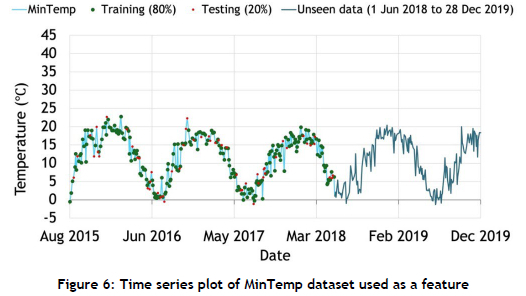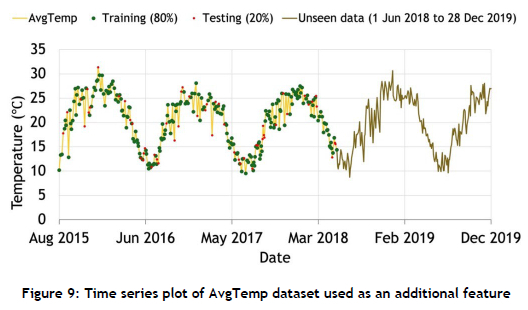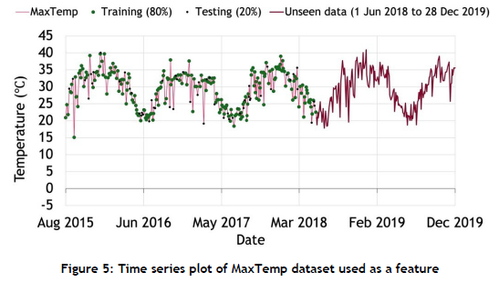 Pearson's correlation was calculated to compare the input features with one another. The correlations were calculated in MATLAB, with the results shown in Table 2. The light pink shaded cells in Table 2 indicate that the MaxTemp and MinTemp variables had a very strong correlation of 73%. An alternative to having two correlated features in the model was to replace the variables with an average value called AvgTemp. Figure 9 shows the AvgTemp dataset and its breakdown into the training, test, and unseen datasets used in the ML model building.