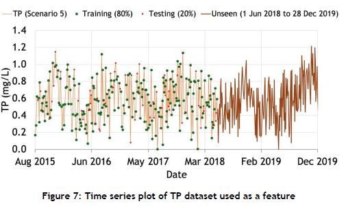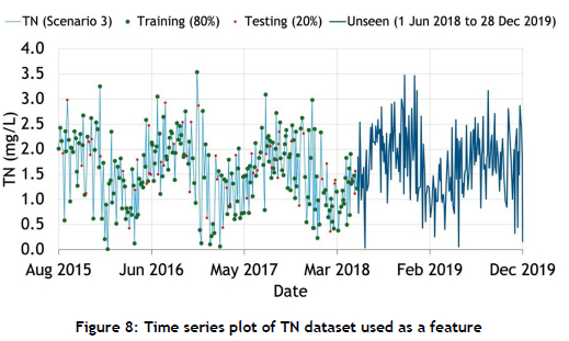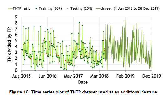 WHC predictions for 1 June 2018 to 28 December 2019 were made using the ensemble (bag) model combining Date, MaxTemp, MinTemp, and TNTP features. The feature analysis indicated that the ratio of the features TN to TP had a higher significance than keeping the features separate, and allowed the model to learn patterns from both nutrients that were not evident when kept separately.