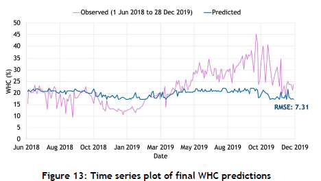 The final predictions made on unseen data are shown in Figure 13 together with the observed unseen WHC dataset. These predictions resulted in an RMSE of 7.31. This was much higher than the results of the test dataset with an RMSE of 2.73. However, it is clear in Figure 13 that the model became inaccurate after May 2019. When excluding predictions after May 2019, the RMSE was 4.01.