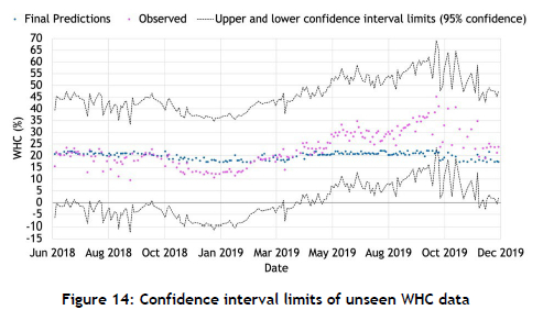 Further analysis was performed by calculating the 95% confidence intervals of the observed data. Figure 14 depicts these intervals and the observed and predicted values from June 2018 to December 2019. Even though the values became inaccurate after May 2019, they remained within the 95% confidence interval for all except two data points near October 2019. The observed WHC values were more volatile from September 2019, causing the confidence interval to fluctuate significantly after this date.