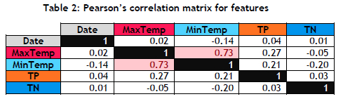 The features identified as important for WHC predictions were Date, MaxTemp, MinTemp, and the generated TP and TN datasets. Based on a suggestion from [44], the features were analysed to ensure that they resulted in good final predictions. Feature analysis was conducted to determine the features that would positively impact the model's performance.