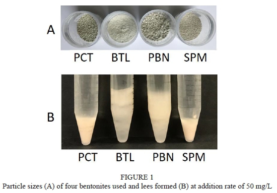 The concentrations of TLPs and chitinases in Chardonnay and Sauvignon Blanc wines were determined at 84.3 mg/L and 5.7 mg/L, and at 49.4 mg/L and 3.0 mg/L, respectively (Table 3), which are within the concentration range reported in previous studies (Le Bourse et al., 2011; Tian et al., 2017). Comparing to Sauvignon Blanc, Chardonnay had higher concentration of TLPs and chitinases, which could lead to a high bentonite requirement for protein stabilization as PR proteins have a linear correlation with bentonite requirement (Tian et al, 2017). After bentonite fining, the concentration of TLPs in Chardonnay was reduced to 5.3 mg/L, 4.9 mg/L, 4.6 mg/L and 3.9 mg/L by adding 50 mg/L of PCT, BTL, PBN and SPM, respectively. Chitinases in Chardonnay were completely removed after bentonite fining. Both TLPs and chitinases in Sauvignon Blanc were completely removed after bentonite fining. Four types of bentonite samples (PCT, BTL, PBN and SPM) at the same addition rate have shown similar efficiency in removing PR proteins in both Chardonnay and Sauvignon Blanc wines, but the bentonite lees formation varied among the different types of bentonites with BTL (Na-Ca bentonite) resulting in the most fluffy lees and SPM (Ca-Na bentonite) the most compact lees (Fig. 1). To reduce the loss of wine volume due to bentonite lees formation, SPM is recommended for protein stabilization in comparison with the other three types of bentonite samples.