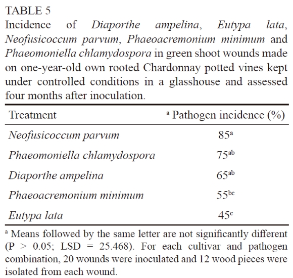 Green shoot wounds on potted Chardonnay and Crimson Seedless plants were susceptible to P. chlamydospora and E.lata. The analysis of variance did not reveal a significant cultivar × treatment interaction (P = 0.78), which indicates that both cultivars responded similarly to the two pathogens. For both Chardonnay and Crimson Seedless, significant differences were found between the pathogen treatments (P = 0.0009 for Chardonnay and P = 0.0001 for Crimson Seedless). The incidence of P. chlamydospora in inoculated green shoot wounds was significantly higher than that of E. lata in Chardonnay and Crimson Seedless (Table 4). No trunk disease pathogens were isolated from the controls. For the second trial, all of the inoculated fungi were re-isolated (Table 5). Significant differences were found between the pathogen treatments (P = 0.0018). Neofusicoccum parvum was isolated from 85% of the wounds, thus its occurrence was significantly higher than that of P. minimum (55%) and E. lata (45%). No trunk disease pathogens were re-isolated from the controls.