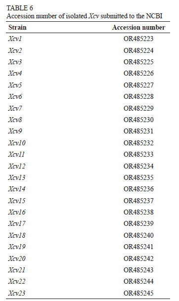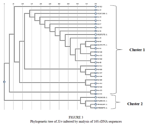 Here, we present a systematic approach to generating and validating diversity among species/supraspecies levels using the 16S rRNA gene, which was also proved by Escapa et al. (2020). Previous studies on membrane protein analysis, fatty acid profiling and 16s rRNA analysis showed a high similarity among several strains or pathovars ofXanthomonas (Ndongo et al., 2018). Comparisons of sequence variation in the 16S rRNA region among 23 strains of Xcv from different locations showed more than 97% similarity. In addition, partial 16S rRNA sequences were identical among the strains of Xcv studied, and the current findings support the study of Kamble et al. (2019). There is limited information describing the genetic diversity of Xcv, compared to the closely related pathovars of Xcc.