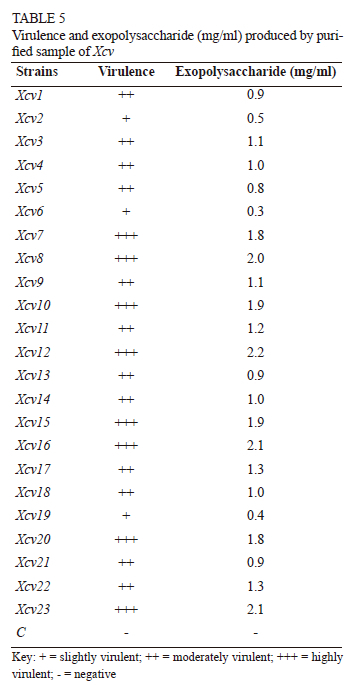 All the strains were able to produce a significant amount of exopolysaccharides (EPS), ranging from 0.3 mg/ml to 2.2 mg/ml (Table 5). Highly virulent strains of Xcv were able to produce larger amounts of EPS compared to the others. Isolates Xcv7 (1.8 mg/ml), Xcv8 (2.0 mg/ml), Xcv10 (1.9 mg/ml), Xcv12 (2.2 mg/ml), Xcv15 (1.9 mg/ml), Xcv16 (2.1 mg/ml), Xcv20 (1.8 mg/ml) and Xcv23 (2.1 mg.ml), from Verkheda, Satana, Sarole, Walwa, Narayangaon, Vijayapura and Theni respectively, produced the maximum amount of EPS, ranging from 1.8 mg/ml to 2.2 mg/ml. Isolates from Bhuvana (Xcv1), Thengoda (Xcv3, Xcv4), Palkhed (Xcv5), Karsul (Xcv9), Belanki (Xcv11), Kuchi (Xcv13), Karoli (Xcv14), Mohal (Xcv17), Pandharpur (Xcv18) and Theni (Xcv21 and Xcv22) produced moderate amounts of EPS, ranging from 0.8 mg/ml to 1.3 mg/ml. The smallest amounts of EPS were produced by Xcv2 (0.5 mg/ml), Xcv6 (0.3 mg/ ml) and Xcv19 (0.4 mg/ml) from Sompur, Verkheda and Vijayapura respectively (Table 5).