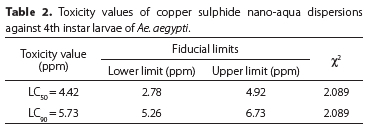 Copper nanoaprticles (CuNPs) are considered to have antifungal, antibacterial and antiplasmodial potential; so we intend to evaluate if they could be applied as mosquito larvicidal agents. Previous studies demonstrated tthat bulk copper particles were less efficient as compared to CuNPs against fungal and bacterial infections (Rai et al. 2018). To the best of the authors' knowledge, it is the first report on the use of copper sulphide nanoparticles as larvicidal agents against Ae. aegypti. No previous report has been documented about copper sulphide nano aqua dispersions as larvicidal agents against any of the mosquito species, but several nanoparticles such as silver (Yadav & Prakash 2016), gold (Soni & Prakash 2012), palladium (Minal & Prakash 2018), copper (Ramyadevi et al. 2011), zinc (Vijayakumar et al. 2015), silica and carbon(Murugan et al. 2016) nanoparticles, were exemplifiedtobe thebest candidatesformosquitocontrol.