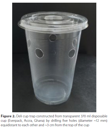 One hundred transparent deli cup traps were constructed from 370 ml disposable cups (Everpack, Accra, Ghana) by drilling five holes (diameter ~12 mm) equidistant to each other and ~3 cm from the top of the cup (Figure 2). The traps were baited with the four food-based baits, so that there were 25 cups each baited with 30 ml of PW, SCS-W mixture, ACV or Y-S mixture. These were deployed systematically in the orchard by hanging them singly at the distal ends of branches of the citrus trees so that same baits do not repeat directly after each other. The distance between traps was 12 m x 24 m and they covered ~2 ha of the citrus orchard (Figure 3). Contents of baited traps were checked weekly.