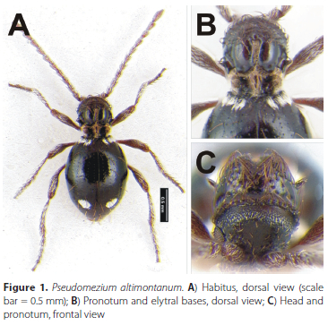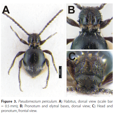 This species is easily distinguished from all other known Pseudomezium species known by the elytra lacking basal maculation and the apical maculation being barely visible; and the lack of elytral interpuncture setae. The three dorsally projecting spines on the pronotum are also notably asetose. Size range. 2.3-2.4 mm