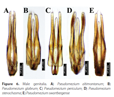 This study was based upon the 34 specimens from the Ditsong National Museum of Natural History in Pretoria, South Africa. Photographs were taken with a JVC KYF75U camera mounted on either a Leica* MZ16 dissecting scope or an Olympus* BH-2 compound microscope, using the Syncroscopy* automontage system. Genitalia dissections were made after softening specimens in hot water, separating the abdomen from the rest of the body, soaking the abdomen in lactic acid to soften tissues, removing the genitalia and placing them in glycerin. They were then studied and imaged on a microscope slide and later for permanent storage placed in a genitalia vial that is on the same pin as the dissected specimen.
