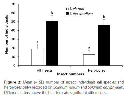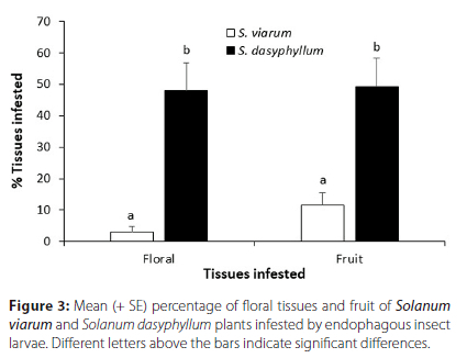 Similarly, the percentage of fruit infested by endophagous insects (Figure 3) was significantly lower (χ2 = 9.708, df = 1, p = 0.002) on S. viarum (mean ± SE = 11.5 ± 4.1%) than on S. dasyphyllum (49.2 ± 9.0%). Although the fruit-boring moth D. laisalis (Pyraustidae) and two fruit-feeding flies, S. ophyroides (Lonchaeidae) and an unidentified species of Agromyzidae, were recorded on both Solanum species, they were more frequent and abundant on S. dasyphyllum (Table 2). In any event, the impact of these fruit borers was negligible, with D. laisalis caterpillars damaging few seeds within infested fruits.
