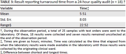 Table 3 presents the duration of the reporting stage for laboratory results from a 24-hour observation of the laboratory. Results were processed for all 25 patients who had test orders sent to the laboratory during the observation period. Test orders were reduced as the haematology instrument was not operational at that time and polymerase chain reaction results for outpatients were delivered through a different mechanism. Additionally, the hospital census was unusually low that day. Of the 25 results, 18 were collected during the 24-hour observation window, whilst seven remained in the pigeon holes. The average duration of the reporting stage was just under six hours, with significant variation. Two of the results were collected immediately because they were related to a critical patient and the laboratory called the ward when the results were available. On the other hand, over one-fifth of results spent more than 16 hours in the laboratory before being collected.
