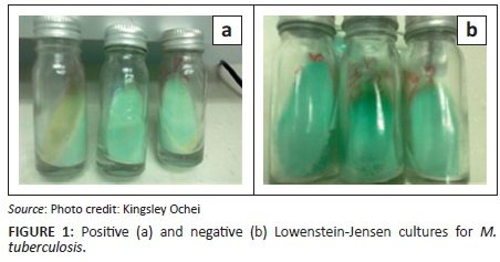 Sputum for the LJ culture technique was selected randomly from the participants' three specimens. An equal volume of 4% sodium hydroxide was added to 5 mL of sputum in a 30 mL screw-cap tube. This tube was capped tightly and shaken to digest the sputum; thereafter, the tube stood at room temperature for 15 minutes with occasional shaking. The mixture was centrifuged at 3000 revolutions per minute for 15 minutes. The supernatant was carefully decanted, after which the deposit was resuspended with 15 mL of sterile normal saline and re-centrifuged at the same rate. The supernatant was removed and the tube sediment of the second centrifugation was inoculated on an LJ agar slope and incubated at 37 °C ± 2 °C. For the first three days, the specimen was observed daily for signs of possible contamination. At weekly intervals over the following six to 10 weeks, the culture was examined regularly for the isolation of M. tuberculosis. Positive and negative growth controls were always included, using wild strains of M. tuberculosis complex and sterile distilled water, respectively. The isolates were identified as Mycobacterium species by the nitrate reduction test, catalase heat-labile test and ZN smear method.