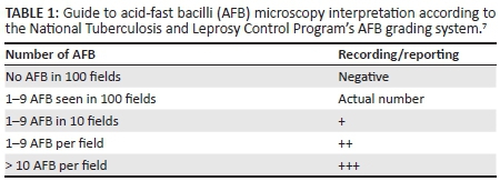 Both the direct and bleach smears were read using the oil immersion lens (×100) of an ordinary light microscope by experienced microscopists who were blinded to the results. Slides were read again in the case of discordant results. For both direct and bleach slides, positive and negative smears were defined according to the National Tuberculosis and Leprosy Control Program's AFB grading system (Table 1).7 A patient was reported smear-positive for TB if at least one to nine AFB were seen in 100 high-power fields. Hence, the study reported on the number of patients diagnosed with active M. tuberculosis infections.