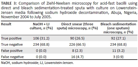 METHODS: Three sputum specimens were collected from each of 340 participants in Abuja, Nigeria, over two consecutive days. Direct microscopy was performed on all specimens; following microscopy, one specimen from each patient was selected randomly for bleach sedimentation and one for Lowenstein-Jensen culture.